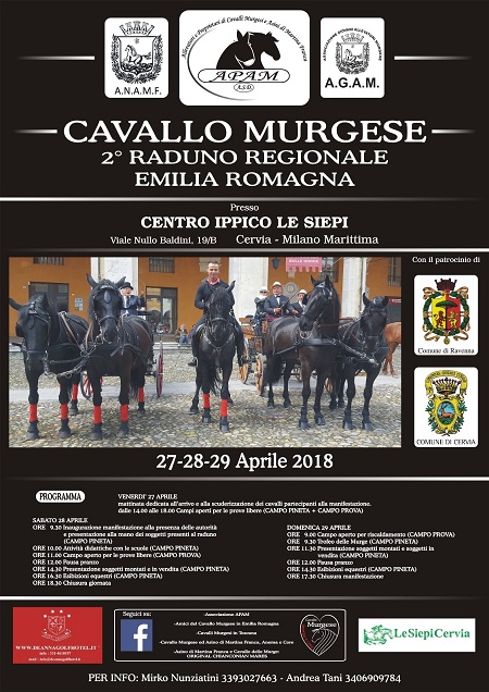 Si terrà dal 27 al 29 aprile in Emilia Romagna il raduno del Cavallo Murgese, ospitato nelle strutture del Circolo Ippico “Le Siepi“ di Cervia, il programma prevede attività didattiche con le scuole, prove libere e piccole esibizioni, la presentazione dei soggetti montati e di quelli in vendita.L’iniziativa è promossa da APAM, Associazione Allevatori e Proprietari di Cavalli Murgesi e Asini di Martina Franca per la valorizzazione delle razze autoctone italiane.